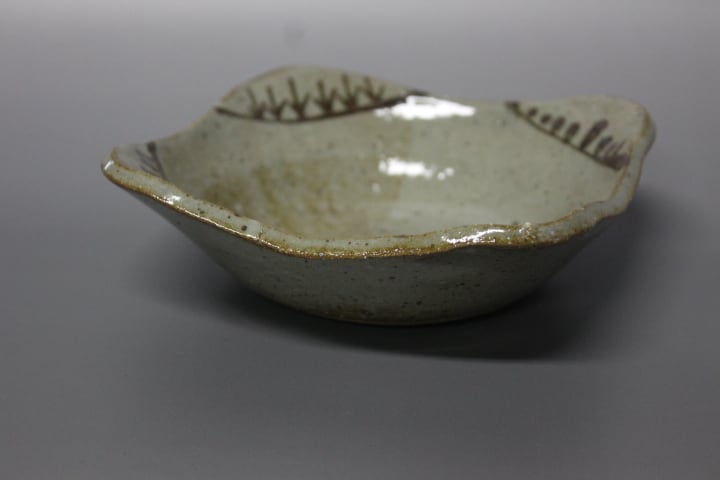 タタラ(板作り)で作った小鉢に 草花文の絵を描きました。