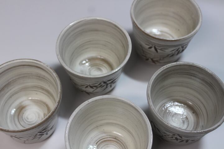 ロクロ成形後 エンゴべ(白化粧)を刷毛で塗り、カンナで竹を彫りました。