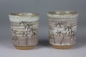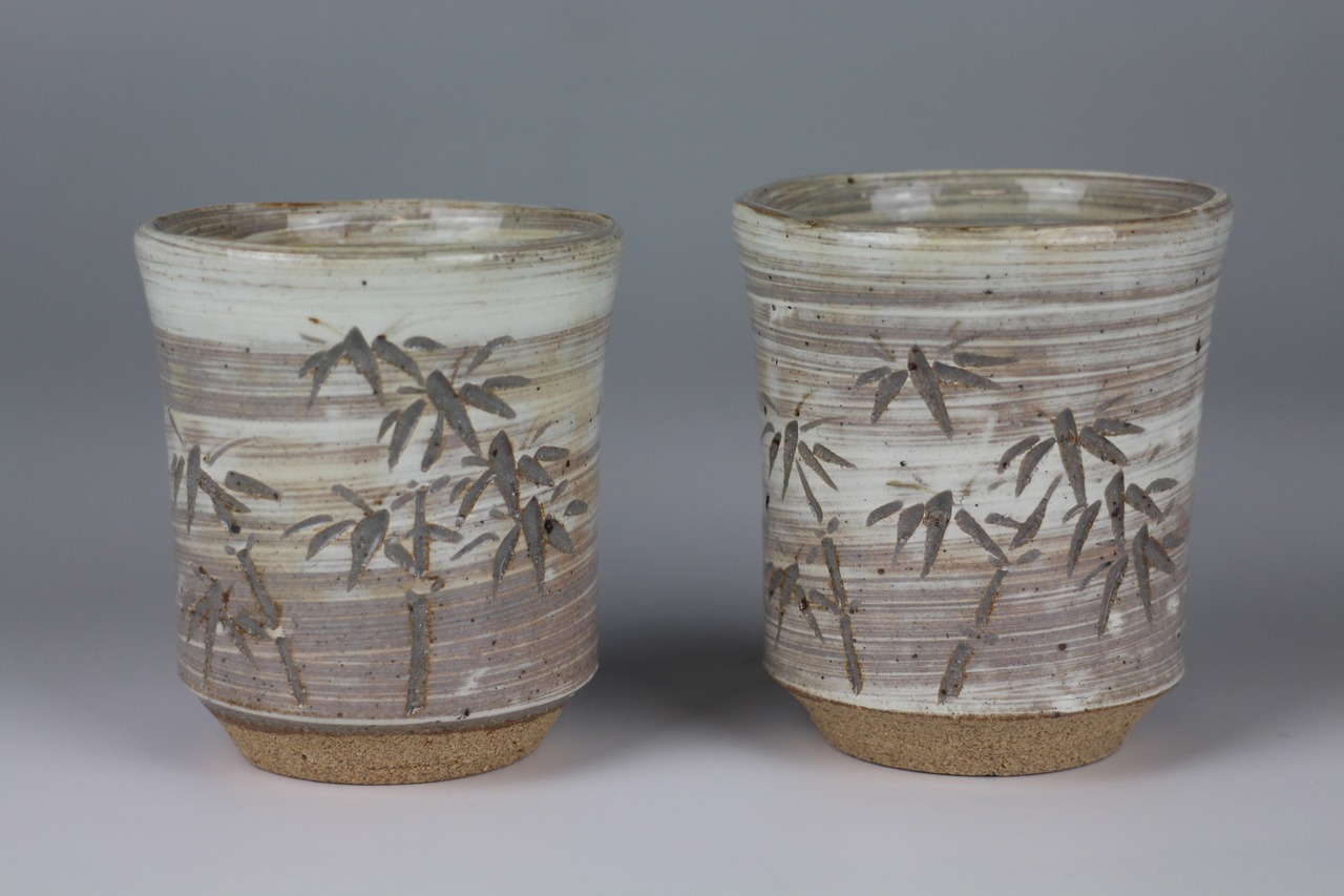 エンゴべを刷毛で塗った上で 竹を彫り彩飾した夫婦湯呑です。